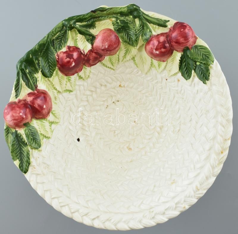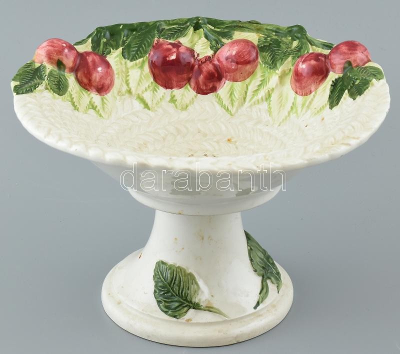 Leírás: Fajansz süteményes kínálótál jelzés nélkül, talp és tál illeszkedésénél ragasztott, ragasztónyomokkal, d: 25 cm