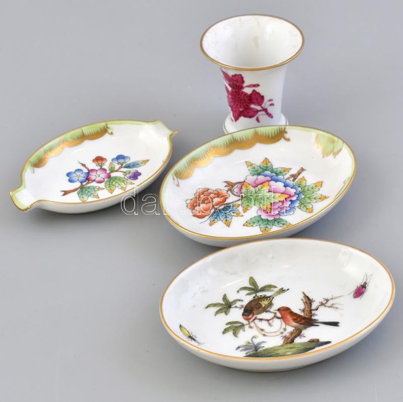 Herendi Apponyi purpur mintás mini váza. Kézzel festett, jelzett, kis kopással, m: 5 cm Herendi Viktória mintás tálka, porcelán, kézzel festett, kopott, jelzett, 10x7,5 cm Herendi Viktória mintás mini hamutál, kézzel festett, jelzett, kis kopással. 9x6 cm Herendi Rotschild mintás tálka. Kézzel festett, jelzett, kopott. 10x7,5 cm