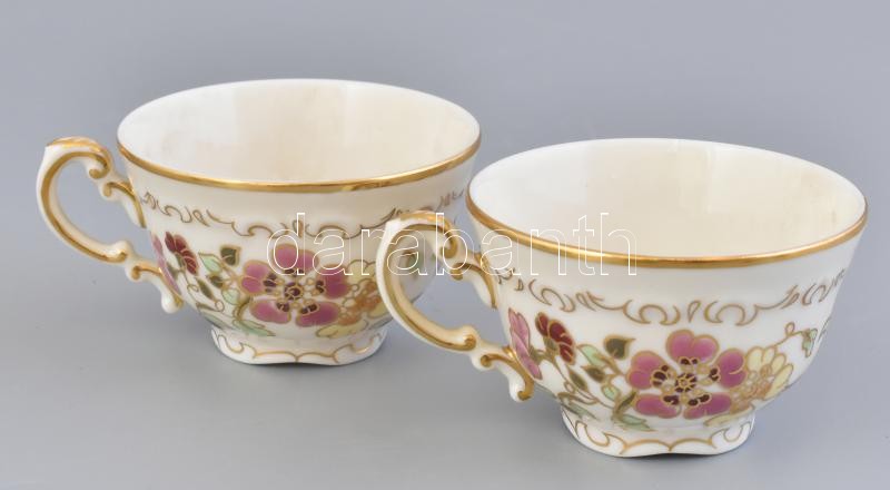 Leírás: Zsolnay pillangó mintás 6 személyes mokkás készlet. Kézzel festett, jelzett, apró kopásokkal.