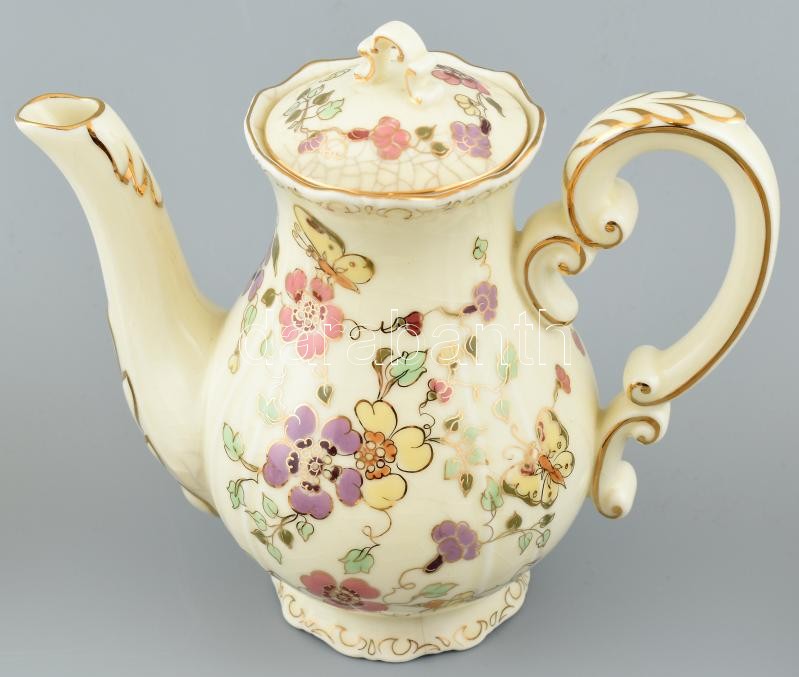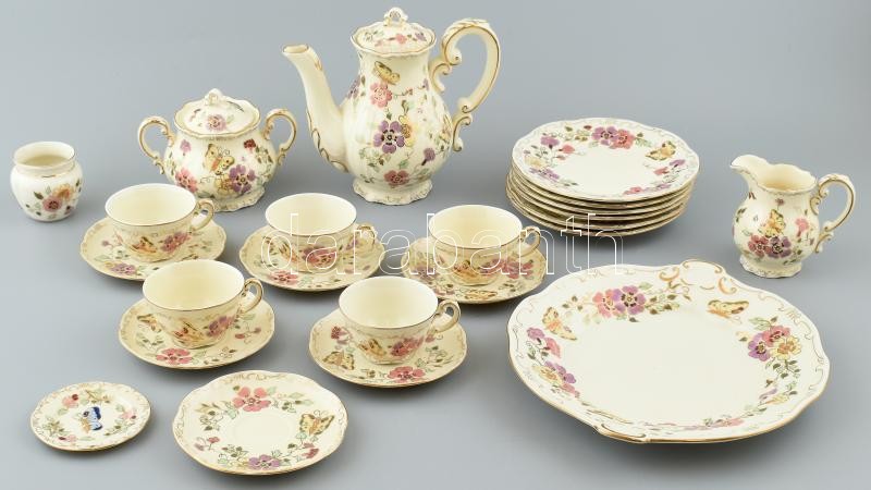 Leírás: Zsolnay pillangómintás hiányos kávéskészlet, 6 db süteményes tányér, 1 db kis kaspó és 1 db poháralátét. Mázrepedt, kopott, jelzett.
