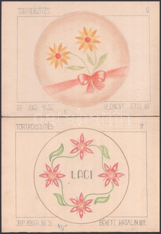 cca 1960-64 10 db diákok által készített tortadíszítő rajz, színes cer... https://www.darabanth.com/hu/402-Gyorsarveres/402.0/Festmenyek-es-grafikak/Festmenyek-es-grafikak-jelzessel-jelzes-nelkul~500006/cca-1960-64-10-db-diakok-altal-keszitett-tortadiszito-rajz-szines-ceruaz-papir-ca-21x30~II2474068