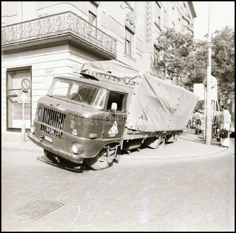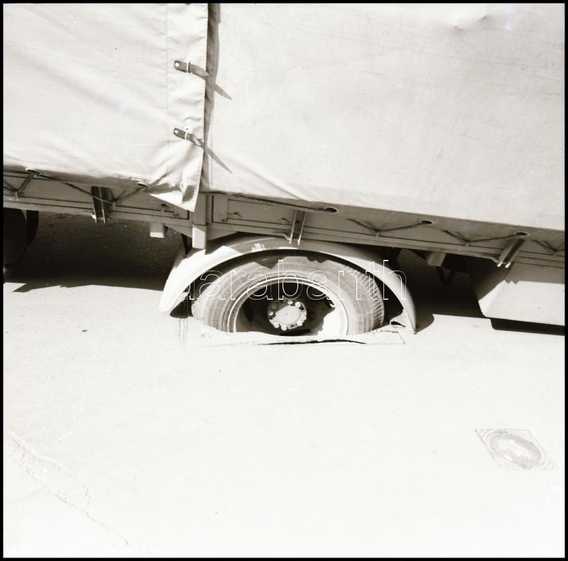 Leírás: 1979 Budapest, teherautó kátyúban, 2 db vintage NEGATÍV, 6x6 cm