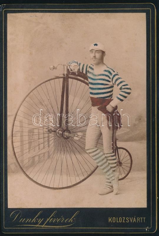 Leírás: cca 1880-1890 Férfi biciklivel, keményhátú fotó a Dunky fivérek kolozsvári műterméből, utólagos színezéssel, 16,5x11 cm