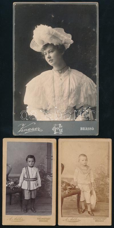 Leírás: cca 1906 3 db brassói keményhátú műtermi portré (gyermek és női), 10,5×6,5 és 16,5×10,5 cm