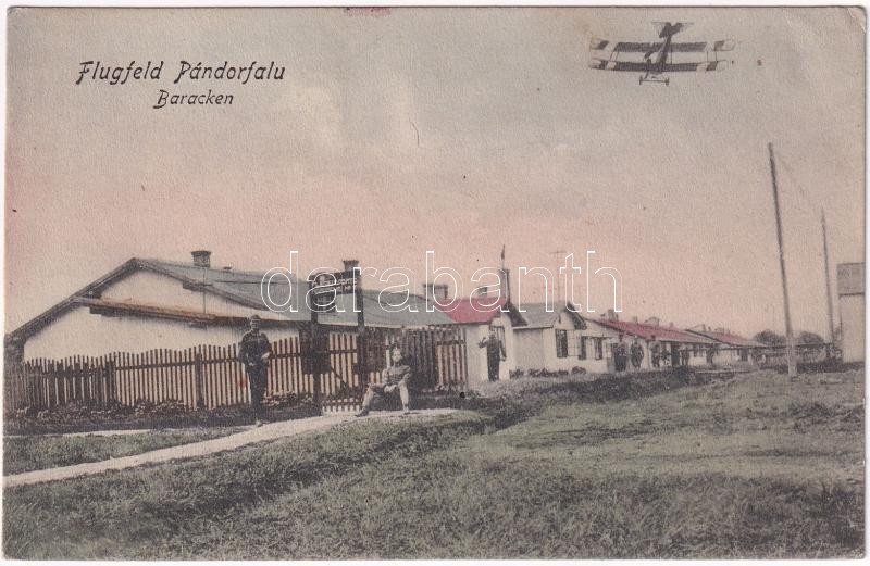 Leírás: Pándorfalu, Parndorf; Flugfeld Pándorfalu, Baracken. Flieger-Ersatz-Kompagnie No. 7. / Osztrák-magyar katonai repülőtér, laktanya, barakkok / Austro-Hungarian K.u.K. military airfield, barracks, soldiers, military aircraft (EK)