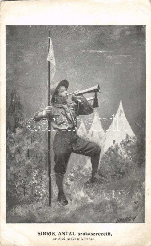 1915 Sibrik Antal szakaszvezető, az első szakasz kürtöse. "Jó munkát" kíván a székesfővárosi Rottenbiller-utcai polgári fiúiskola cserkészcsapata / Hungarian boy scout with horn s: Halácsy (EB)