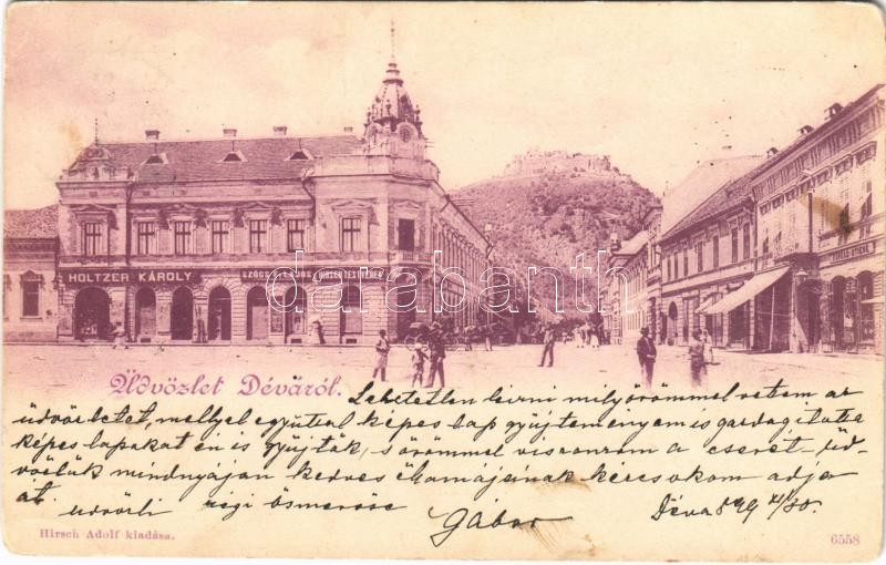 1899 Déva, Deva; vár, Holtzer Károly, Szőcs F. Lajos, Hirsch Testvérek... https://www.darabanth.com/hu/402-Gyorsarveres/402.0/Kepeslapok/Erdely~1000006/1899-Deva-Deva-var-Holtzer-Karoly-Szocs-F-Lajos-Hirsch-Testverek-Farkas-uzlete-Hirsch-~II2472930