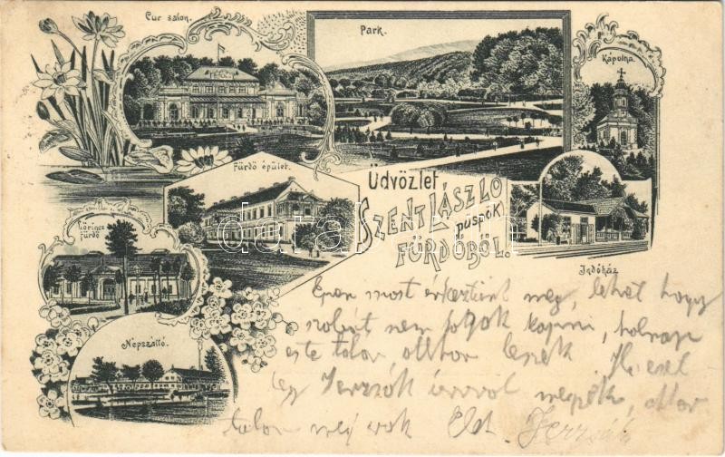 Leírás: 1904 Püspökfürdő, Szentlászlófürdő, Baile 1 Mai; fürdő épület, indóház, vasútállomás, park, Lőrinc fürdő, Népszálló / spa, railway station, park, hotel. Art Nouveau, floral