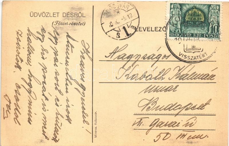 Leírás: 1940 Dés, Dej; Fő tér, bevonulás / main square, entry of the Hungarian troops + "1940 Kolozsvár visszatért" So. Stpl. (EK)