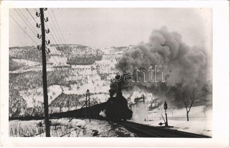 Leírás: 1942 Kolozsvár környéke, near Cluj; vasút, gőzmozdony, tél / train, locomotive, winter. photo