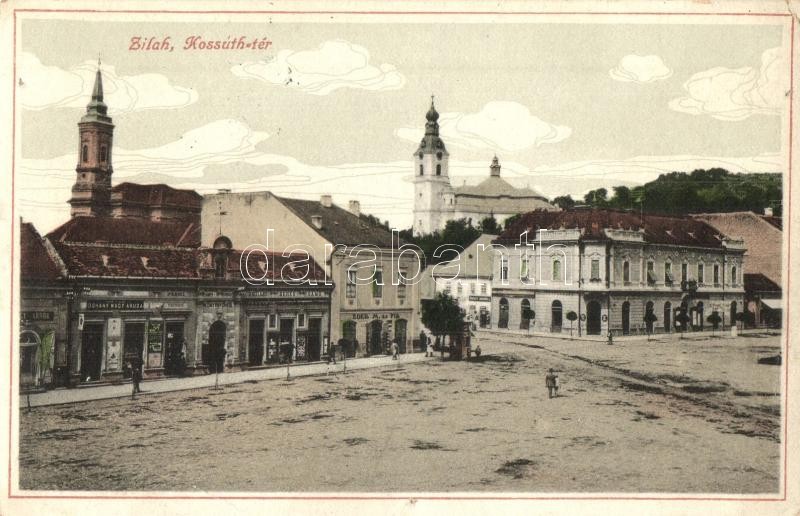 Zilah, Zalau; Kossuth tér, Dohány nagyáruda, Seres Lajos, Seres Samu, Nagy Árpád és Éder M. és fia üzlete, fodrász, könyvnyomda / square, shops, hairdresser (kis szakadás / small tear)