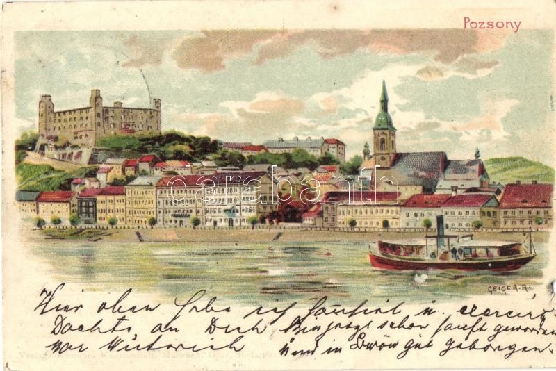 Leírás: 1899 Pozsony, Pressburg, Bratislava; vár, gránátrepesz által sérült lap / castle. Kosmos litho s: Geiger R. (damaged by grenade fragments) (b)