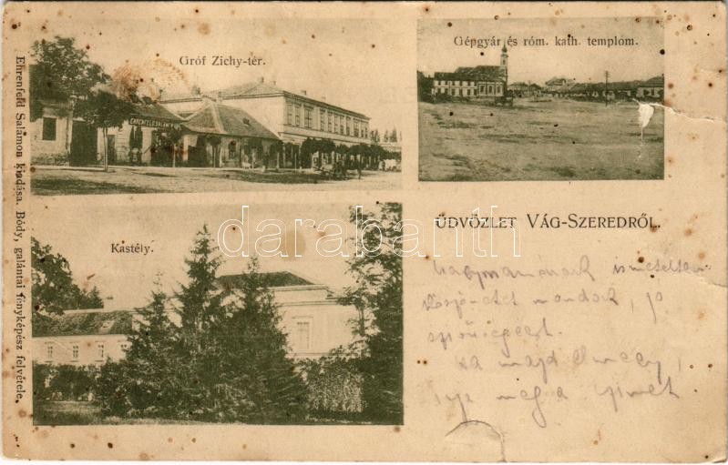 Leírás: 1907 Szered, Vág-Szered, Vágszered, Sered; Gróf Zichy tér, Gépgyár és Római katolikus templom, Esterházy kastély, Ehrenfeld Salamon üzlete és saját kiadása. Bódy galántai fényképész felvétele / square, publisher's shop, machine factory, church, castle (b)