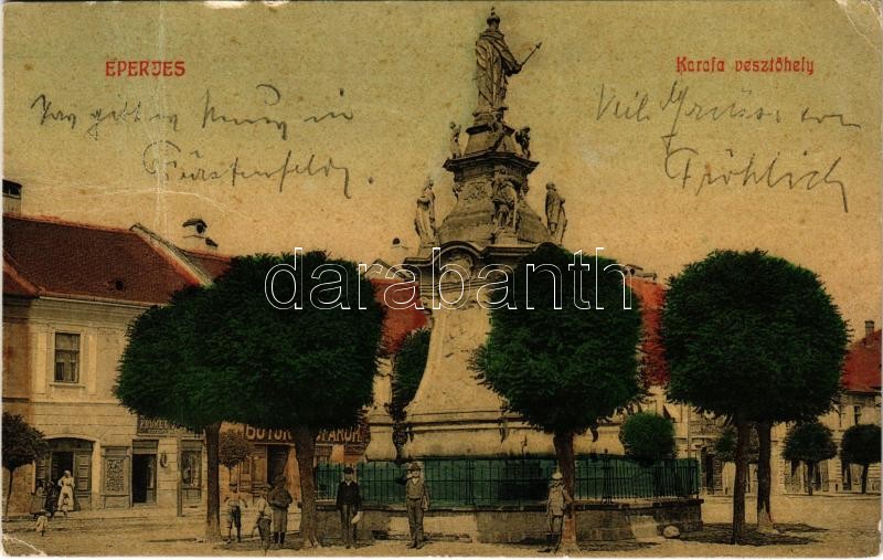 1915 Eperjes, Presov; Karafa (Caraffa) vesztőhely, üzletek / monument,... https://www.darabanth.com/hu/402-Gyorsarveres/402.0/Kepeslapok/Felvidek~1000007/1915-Eperjes-Presov-Karafa-Caraffa-vesztohely-uzletek-monument-statue-shops-fa~II2467950