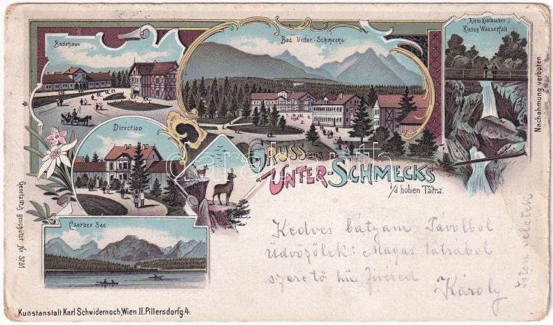 1916 Alsótátrafüred, Tátrafüred, Unter-Schmecks, Dolny Smokovec (Tátra, Magas Tátra, Vysoké Tatry); Badehaus, Bad Unter-Schmecks, Kohlbacher Wasserfall, Direction, Csorber See / Fürdőház, Tarpataki vízesés, Igazgatóság, Csorba-tó / spa, bath, waterfall, directorate, lake. Kunstanstalt Karl Schwidernoch No. 3731. Art Nouveau, floral, litho (EB)