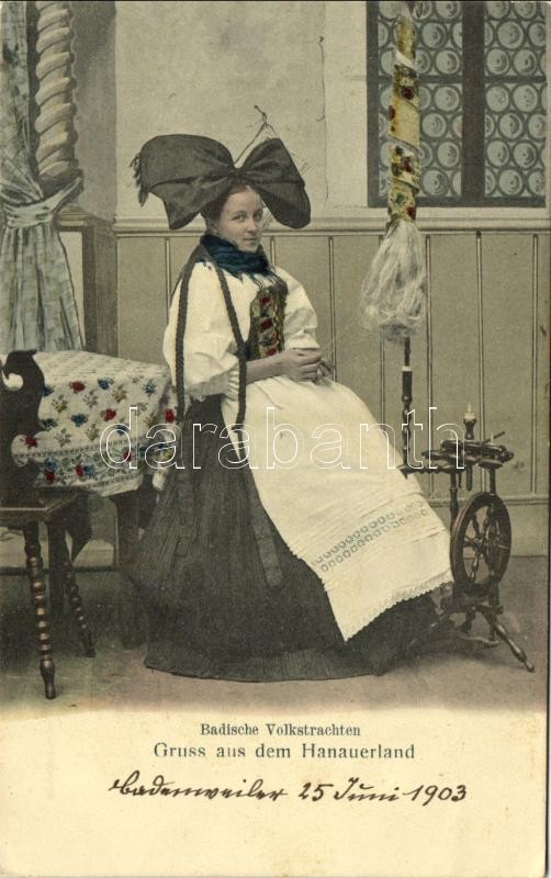 Badische Volkstrachten, Gruss aus dem Hanauerland / folk costume from ... https://www.darabanth.com/hu/402-Gyorsarveres/402.0/Kepeslapok/Folklor~1000088/Badische-Volkstrachten-Gruss-aus-dem-Hanauerland-folk-costume-from-Hanauerland-woman-with-spinni~II2059238