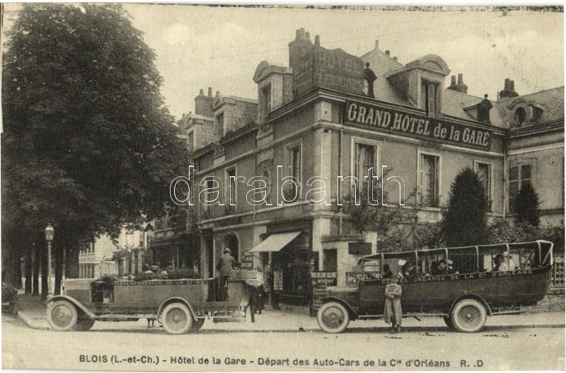 Leírás: Blois, Hotel de la Gare, Départ des Auto-Cars de la Cie d'Orléans / hotel, automobiles