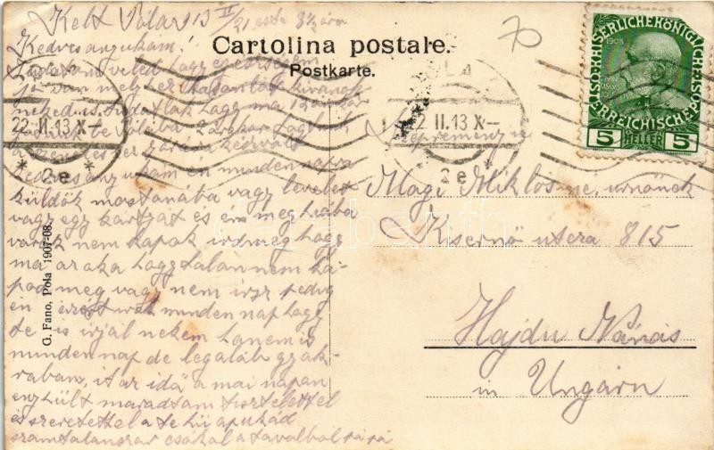 Leírás: 1913 K.u.K. Kriegsmarine 24 cm Geschütz Achterer Turm / Osztrák-magyar haditengerészet hadihajójának 24 cm-es lövege / Austro-Hungarian Navy cannon. Art Nouveau, G. Fano, Pola 1907-08. (EK)