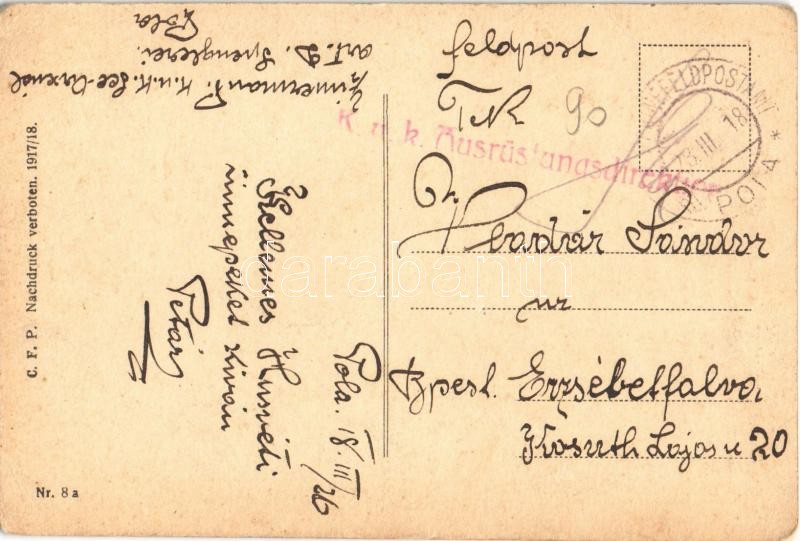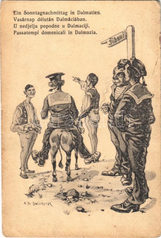 1918 Ein Sonntagnachmittag in Dalmatien / Vasárnap délután Dalmáciában / U nedjelju popodne u Dalmaciji / Passatempi domenicali in Dalmazia / K.u.K. Kriegsmarine Matrose / Austro-Hungarian Navy mariner humour art postcard, Sibenik. C. F. P. Nr. 8a. 1917/18. s: Ed. Dworak + "K.u.K. Ausrüstungsdirektion" (EK)