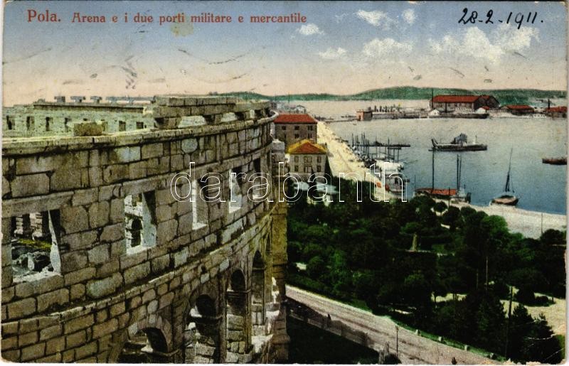 1911 Pola, Pula; Arena e i due porti militare e mercantile / amphitheatre, K.u.K. Kriegsmarine (Austro-Hungarian Navy) port, shipyard. Dep. A. Bonetti (kis szakadás / small tear)