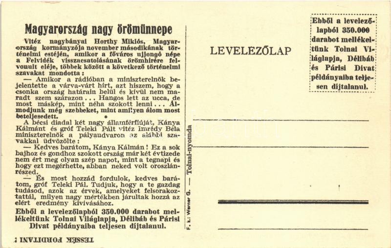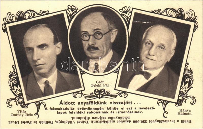 Leírás: Felvidék visszacsatolásának emlékére. Áldott anyaföldünk visszajött... Vitéz Imrédy Béla, Gróf Teleki Pál, Kánya Kálmán. Tolnai Nyomda kiadása / Entry of the Hunagrian troops, Irredenta, Art Nouveau