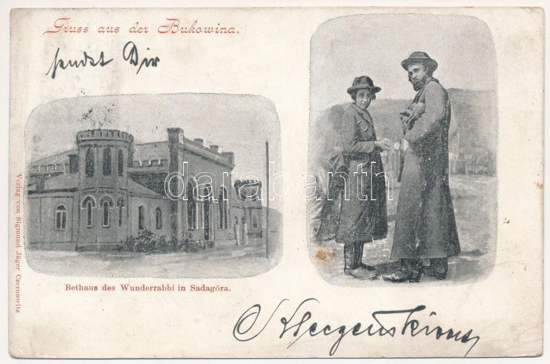 1898 (Vorläufer) Gruss aus der Bukowina, Bethaus des Wunderrabbi in Sadagóra (Sadhora). Judaica / Greetings from Bukovina, prayer house of the Rebbe (rabbi), Jewish men, Old Synagogue (EK)