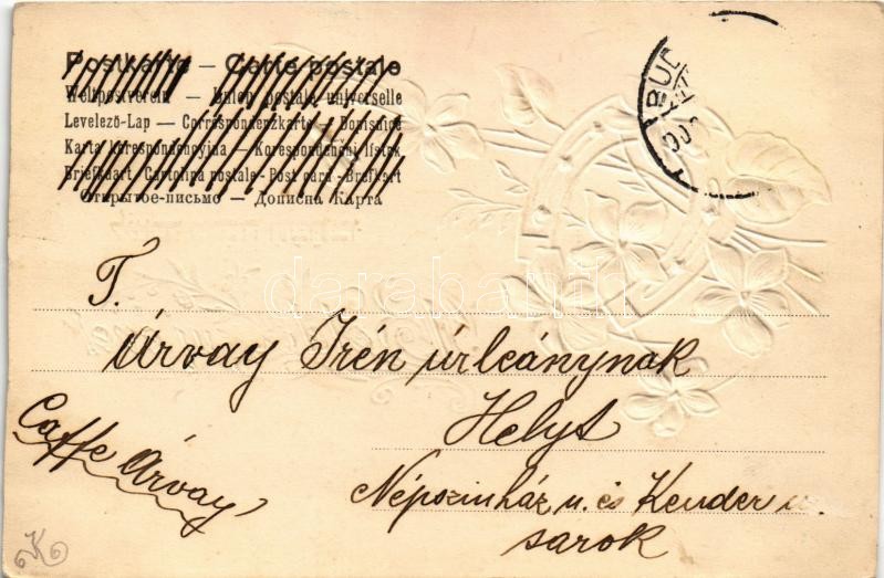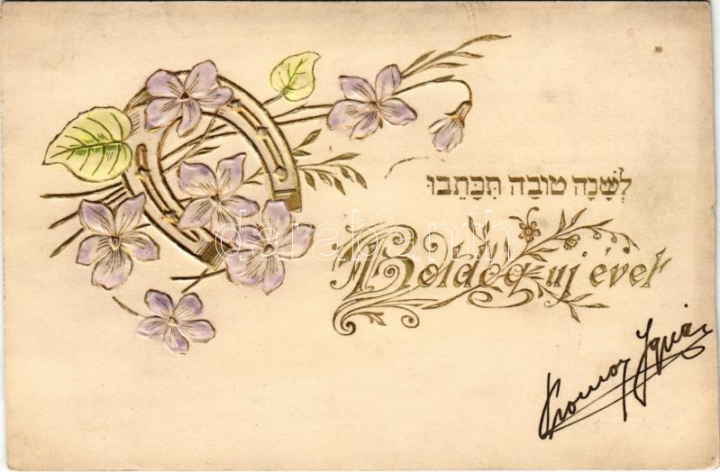 1900 Boldog Újévet! Héber nyelvű zsidó újévi dombornyomott üdvözlőlap / Jewish New Year greeting card with Hebrew text, Judaica. Emb. litho (vágott / cut)