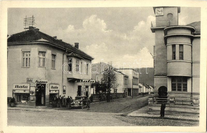 Leírás: Szolyva, Svalova, Svaliava, Szvaljava; utcakép, Bata üzlet, automobil / street view, shop, automobile