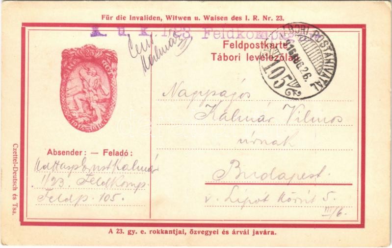 1916 K.u.K. I. R. Nr. 23. / A 23. honvéd gyalogezred jelvény képe tábori postai levelezőlapon / WWI Austro-Hungarian K.u.K. military, 23th Infantry Regiment badge on a military field postcard + "K.u.K. I/23. Feldkompagnie" (EK)