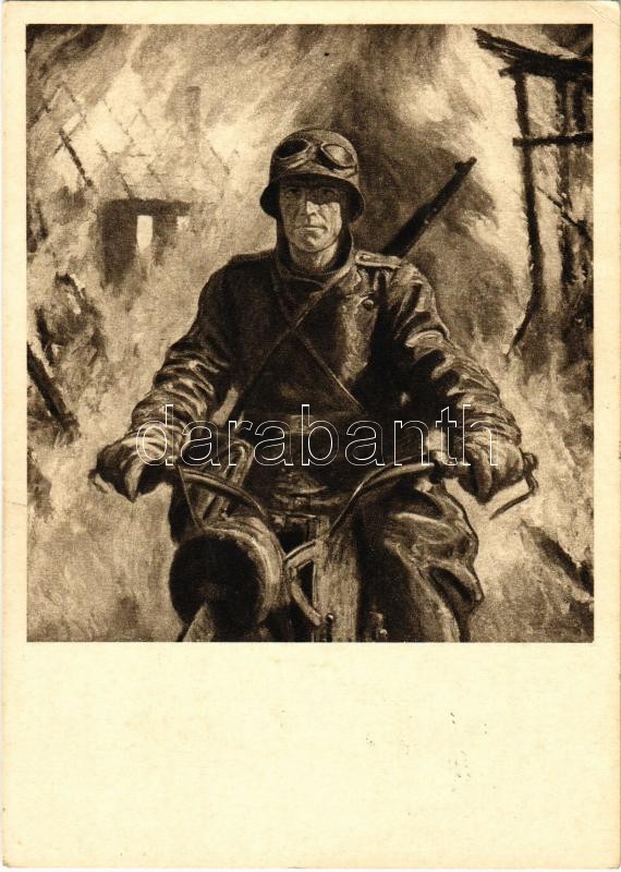 1944 Motorkerékpáros Keleten / WWII German military art postcard, NSDAP German Nazi Party propaganda, soldier with motorcycle s: Otto Engelhardt-Kyffhäuser (EK)