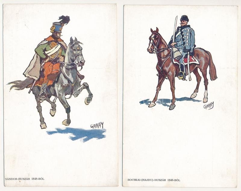 2 db régi katonai művészlap Garay szignóval (A Magyar Huszár 4. és 5. Kiadja Kner Izidor könyvnyomdász) / 2 pre-1945 Hungarian military art postcards: hussars, signed by Garay
