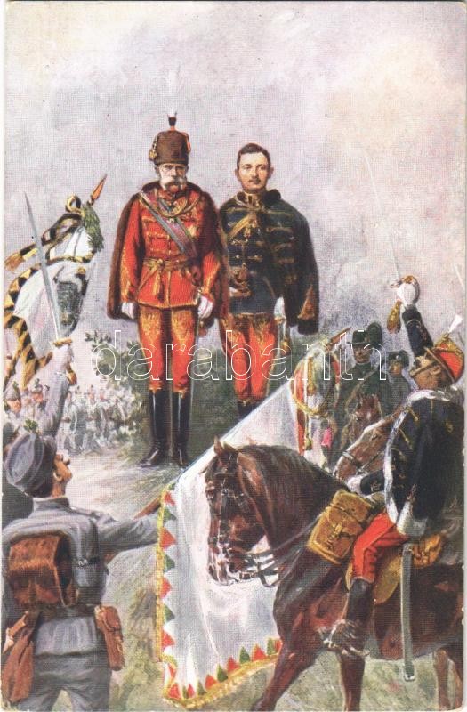 A hadsereg hódolata / Huldigung der Armee / WWI Austro-Hungarian K.u.K. military art postcard, patriotic propaganda with Franz Joseph I of Austria and Charles. Rotophot Nr. 671. s: Geiger