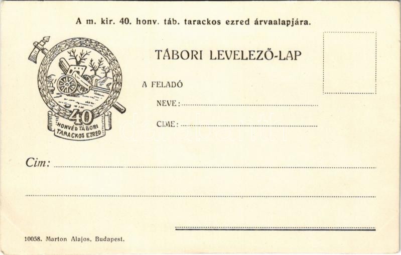 A m. kir. 40. honvéd tábori tarackos ezred árvaalapjára. Tábori Levele... https://www.darabanth.com/hu/402-Gyorsarveres/402.0/Kepeslapok/Katonai~1000083/A-m-kir-40-honved-tabori-tarackos-ezred-arvaalapjara-Tabori-Levelezolap-WWI-Austro-Hunga~II2471730
