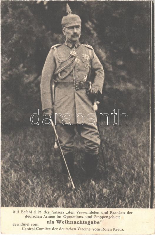 Aus Befehl S.M. des Kaisers "den Verwundeten und Kranken der deutschen Armee im Operations- und Etappengebiete als Weihnachsgabe gewidmet vom Central-Comitee der deutschen Vereine vom Roten Kreuz. Feldpostkarte / WWI German military Red Cross charity card with Wilhelm II (EK)