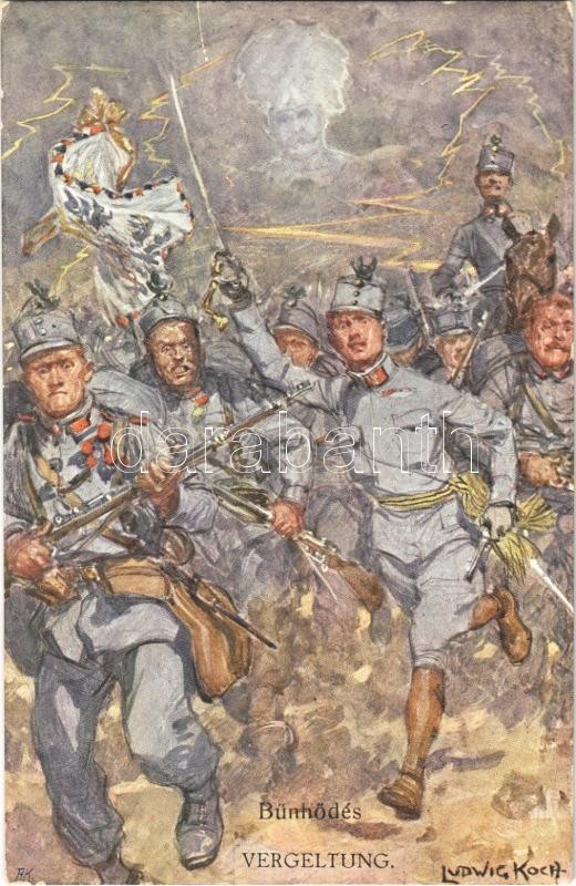 Leírás: Bűnhődés / Vergeltung / WWI Austro-Hungarian K.u.K. military art postcard, soldiers, Franz Joseph I of Austria. B.K.W.I. 259-2. s: Ludwig Koch