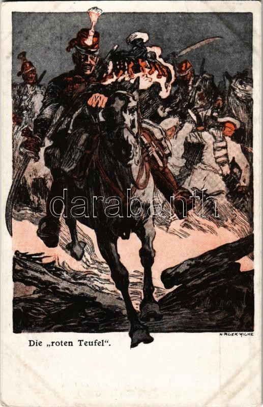 Die "roten Teufel". Offizielle Karte für Rotes Kreuz, Kriegsfürsorgeamt, Kriegshilfsbüro. Kriegspostkarte Nr. 4. "Die Muskete" / WWI Austro-Hungarian K.u.K. military art postcard, hussars s: K. Alex Wilke