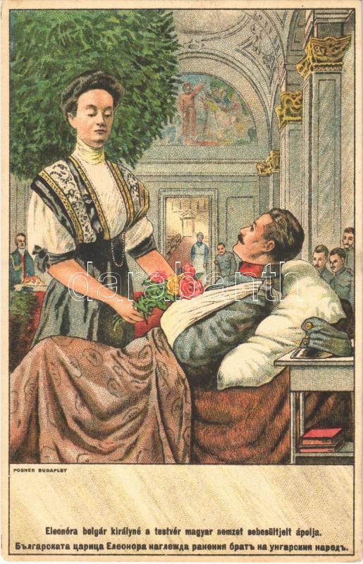Eleonóra bolgár királyné a testvér magyar nemzet sebesültjeit ápolja. Testvéri üdvözletét küldi a vitéz bolgár nemzetnek Magyarországból... a Bolgár Vöröskereszt javára / WWI Austro-Hungarian K.u.K. military art postcard, Bulgarian Tsarina Eleonore nursing injured Hungarian soldiers. Charity card for the Bulgarian Red Cross fund, litho