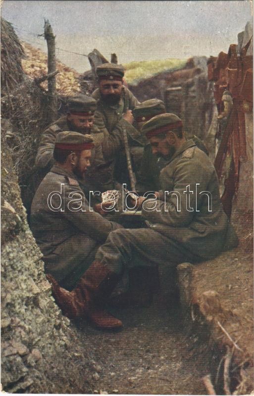 Első világháborús német katonák kártyajáték közben a lövészárokban / WWI German military, soldiers playing card game in the trench / Der europäische Krieg 1914/15. Nr. 105. Ein Spielchen im Schützengraben. Feldpostkarte