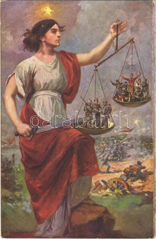 Győzünk, mert velünk az igazság! A m. kir. honvédelmi minisztérium hadsegélyező hivatala kiadása / WWI Austro-Hungarian K.u.K. military art postcard, patriotic propaganda, support fund (EK)