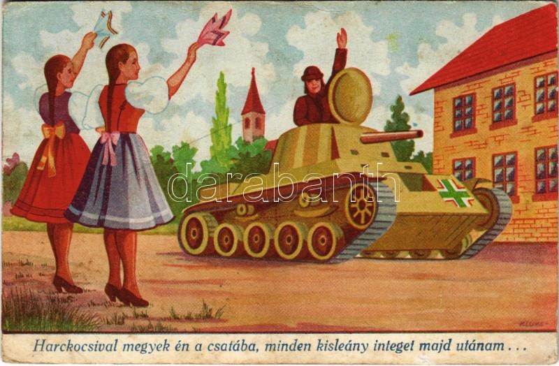 Harckocsival megyek én a csatába, minden kisleány integet majd utánam ... https://www.darabanth.com/hu/402-Gyorsarveres/402.0/Kepeslapok/Katonai~1000083/Harckocsival-megyek-en-a-csataba-minden-kisleany-integet-majd-utanam-WWII-Hungarian-military-~II2471855