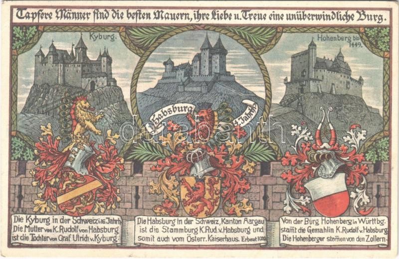 "Tapfere Männer find die besten Mauern, ihre Liebe u. Treue eine unüberwindliche Burg" Kyburg, Habsburg, Burg Hohenberg / WWI Austro-Hungarian K.u.K. military art postcard, charity fund, coat of arms, castles. Offizielle Karte für Rotes Kreuz, Kriegsfürsorgeamt Kriegshilfsbüro Nr. 571. (EK)