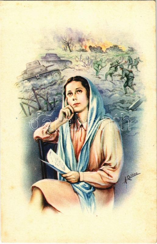 WWII Italian military art postcard, lady with soldiers and tanks. Ceca... https://www.darabanth.com/hu/402-Gyorsarveres/402.0/Kepeslapok/Katonai~1000083/WWII-Italian-military-art-postcard-lady-with-soldiers-and-tanks-Cecami-N-1023-s-Collino-fl~II2471351