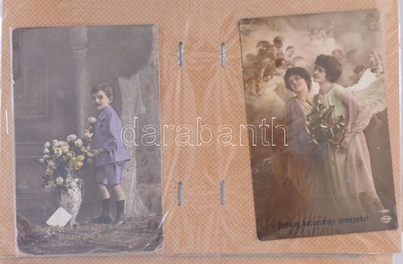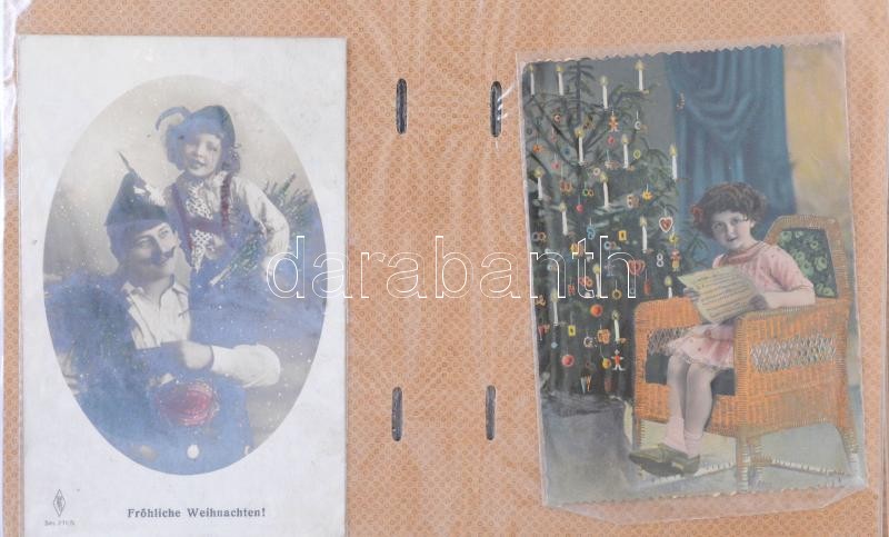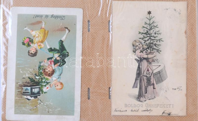 200 db RÉGI magyar motívum képeslap albumban: Karácsonyi és újévi üdvözletek, művész, humor... stb. / 200 pre-1945 Hungarian motive postcards in an albumm: Christmas and New Year greetings, art, humour... etc.