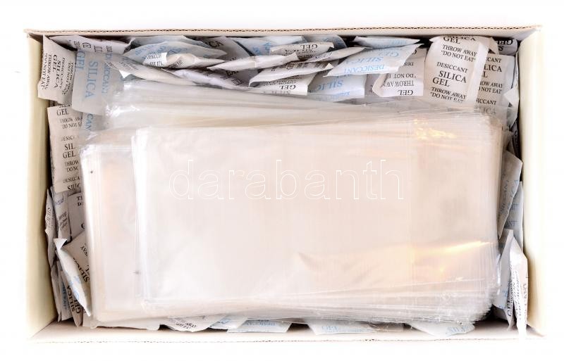 Egy cipősdoboznyi db B.O.P.P. nagyobb méretű (17 cm x 10,5 cm) műanyag képeslaptartó tok + páramegkötő szilikagél tasakok (nedvszívó) / A shoe box of bigger sized (17 cm x 10,5 cm) plastic postcard carrying cases + desiccant silica gel packets
