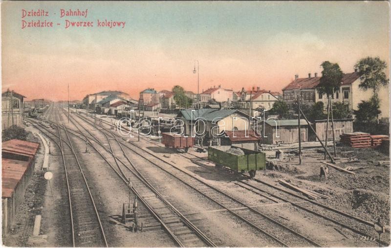 Leírás: Dziedzice, Dzieditz (Czechowice-Dziedzice); Bahnhof / Dworzec kolejowy / railway station, locomotive, train. B.K.Sch. 181/3.