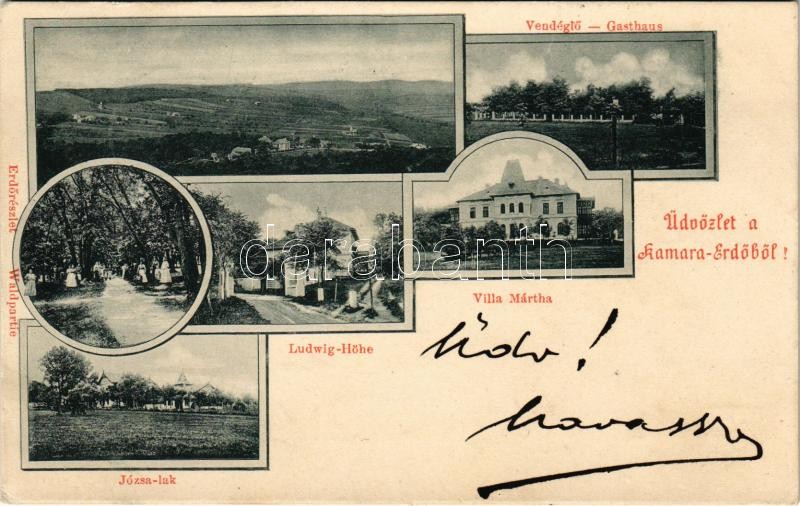 Leírás: 1900 Budapest XI. Kamaraerdő, Kamara-Erdő; vendéglő, Józsa lak, Villa Mártha, Ludwig Höhe, erdő részlet. Art Nouveau (EK)