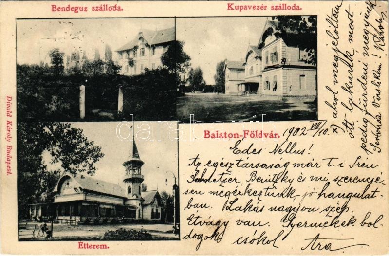 Leírás: 1902 Balatonföldvár, Bendegúz szálloda, Kupavezér szálloda, étterem. Divald Károly kiadása (EK)