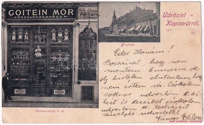 1902 Kaposvár, Fő utca, Goitein Mór órás és ékszerés üzlete a Korona u... https://www.darabanth.com/hu/402-Gyorsarveres/402.0/Kepeslapok/Magyarorszag~1000005/1902-Kaposvar-Fo-utca-Goitein-Mor-oras-es-ekszeres-uzlete-a-Korona-utca-4-szam-alatt-G~II2472464