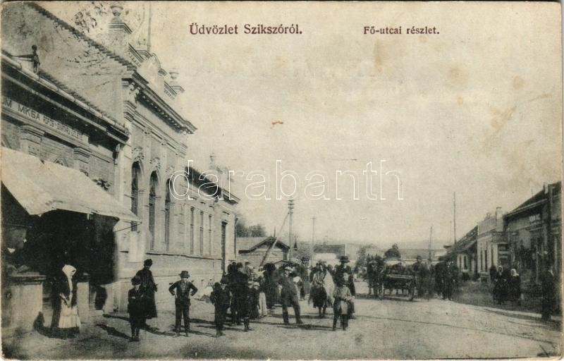 Leírás: 1912 Szikszó, Fő utca, üzletek, hatósági mészárszék. Stamberger Márk kiadása (fl)