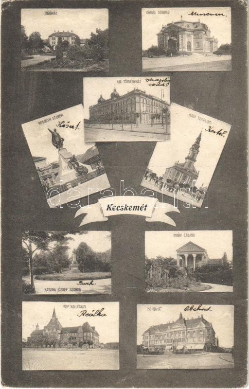 Leírás: 1915 Kecskemét, mozaiklap, rajta vasútállomás, városi színház, templomok, stb. (EK)